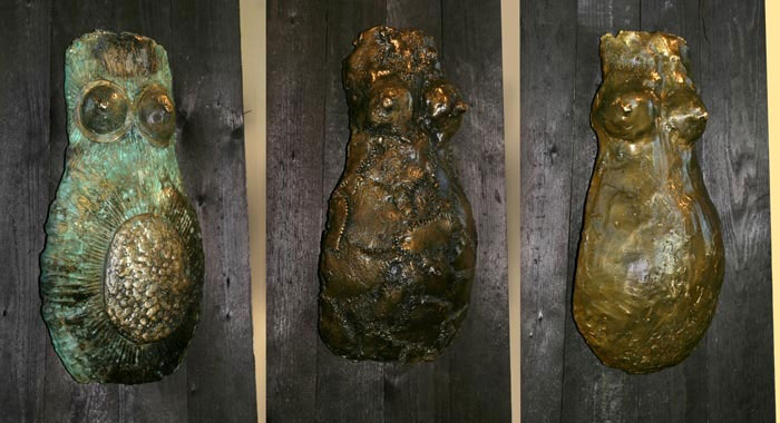 afgehaald en tien lange ijle bronzen dames op een keramische sokkel,