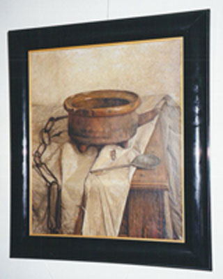 C.A.Feldmann, "Stilleven met aardewerken pan en tinnen lepel," 43 x 36 cm,