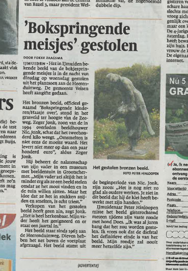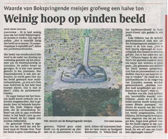 Aangifte van diefstal is gedaan bij Politie Kennemerland op 25-8 jl., onder nummer PL1200-100825-271600482. Indien u informatie heeft over bovengenoemd beeld , dan verzoeken we u kontakt op te nemen met de politie: tel: 0900-8844 of met gestolen kunst 06-20571436